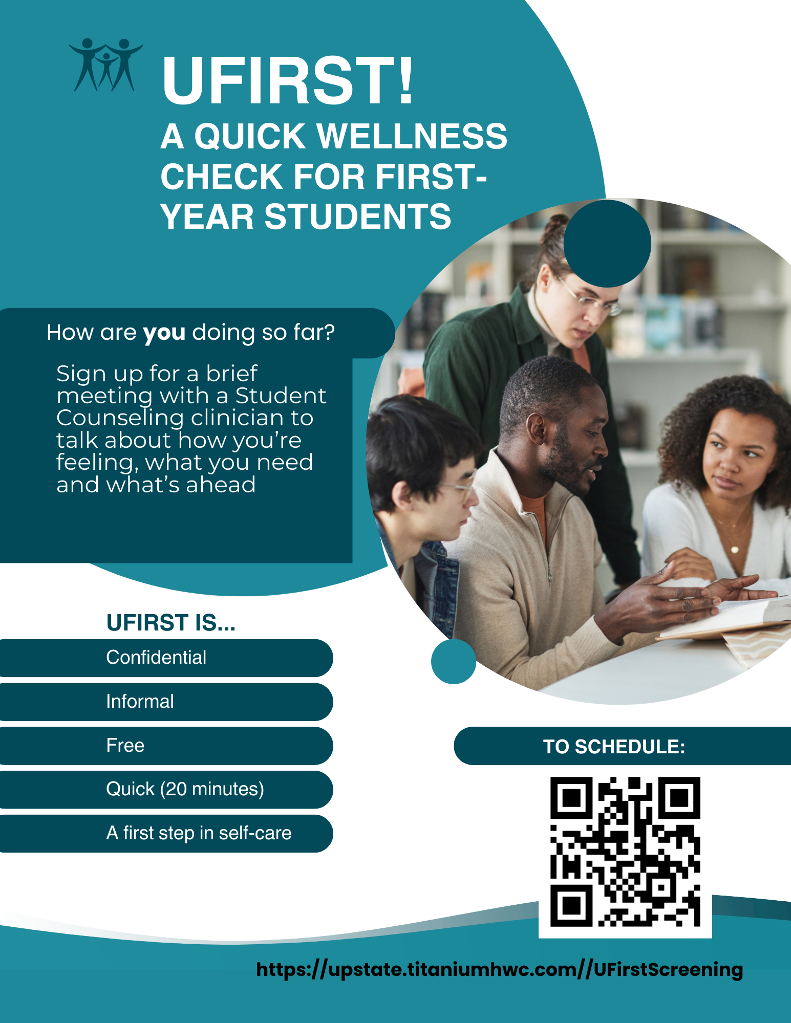 I wanted to let you know that Student Counseling recently launched a new program, "UFirst!", that is now available to all first-year students in the CHP. This offers students a brief, confidential meeting with an SCS clinician to discuss how things are going for them in this first year and to help connect them with additional Student Affairs or community resources that might be helpful. It also allows us to do a brief mental health screening and provide early intervention and referral to ongoing mental health services as appropriate. Our goal has been to reduce the stigma and mystery around SCS and to give students a chance to check in about their wellness, even if they're not experiencing an acute mental health concern. Students can self-schedule online, which makes it more convenient for them too.