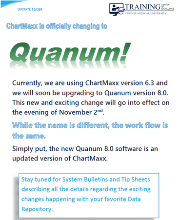 On 11/2/2021, Quest resources will be upgrading our Quanum (ChartMaxx) applications to v8. We will begin our downtime at 6:00 PM and expect to have the system upgraded and delivered back to you by 11:30 PM.