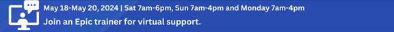 In efforts to provide real-time assistance, trainers will offer virtual support to diagnose and resolve issues, Saturday, May 18, 2024, 7:00am-6:00pm, Sunday and Monday May 19-20 from 7:00am-4:00pm. Virtual Support is accessed directly from Hyperspace under the Epic button by selecting Virtual Support. Read how to connect to a trainer from the desktop in the Virtual Support for Epic<https://www.upstate.edu/training/intra/epic/documents/virtual_support_for_hyperdrive_super_users.pdf> Tip Sheet.