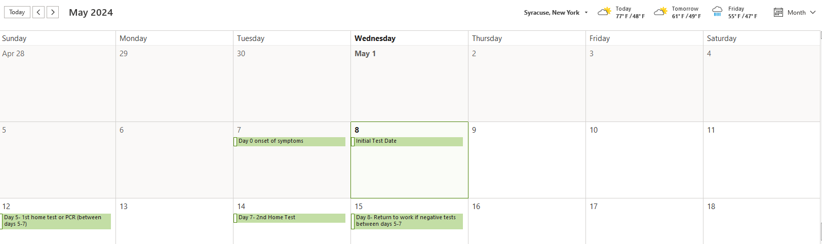 Sorry to hear that, hope you get feeling better soon. You will not be able to come back on Friday, the earliest would next Wednesday 5/15 per the policy https://urldefense.com/v3/__https://upstate.ellucid.com/documents/view/10492/active/__;!!GobTDDpD7A!MpyHTo1RcDMEic3PxIXthv6Fy3kbxDmUfIq1Hn-m9Ofrm1v-pMic-EuphGafNYwD0ZW2wV8kesZfpzlhAFExrFWtKII5Z9P-$