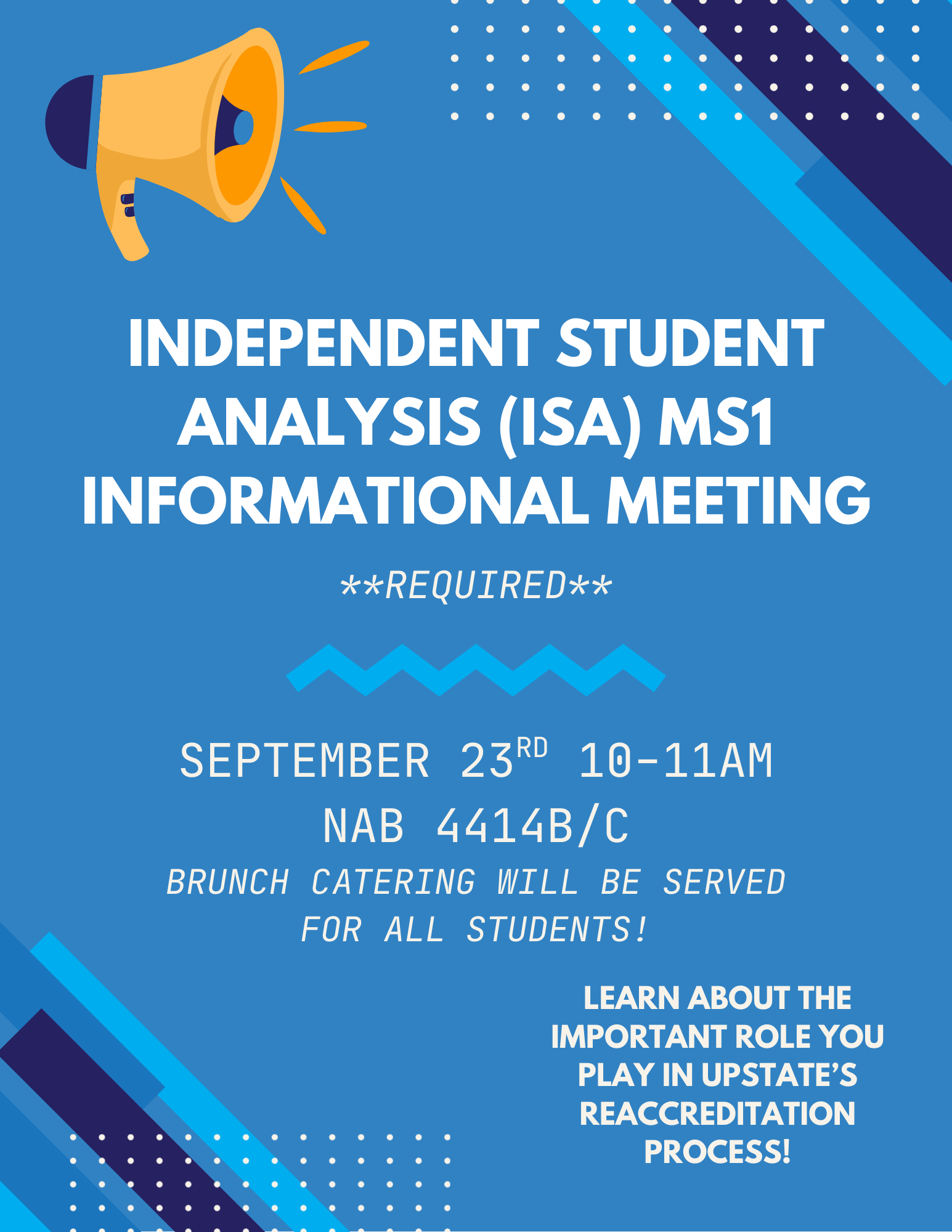 As students, you are not required but are highly encouraged to complete the ISA. During this informational session, we will provide you all with free lunch and give a short presentation about our reaccreditation and the ISA survey. We will then give you the opportunity to complete the ISA and ask us any questions you may have while completing the survey.
