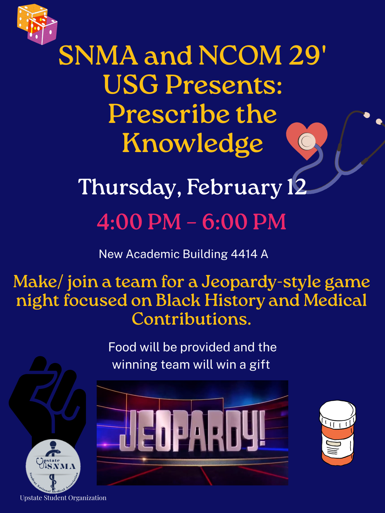 SNMA and NCOM 29' are excited to announce "Prescribe the Knowledge", a Jeopardy-style game quizzing on Black History and Medical Contributions! Food is provided and gifts will be given to winners, so start making or joining teams now! Please use the sign up sheet below to attend.