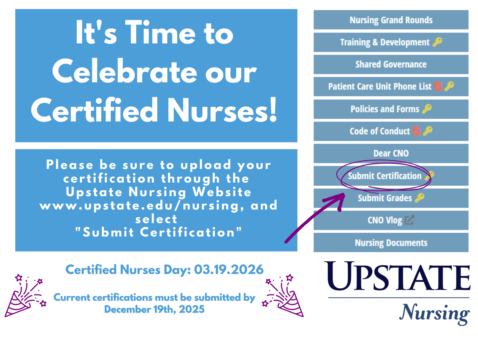 Certified Nurses Day is March 19, 2026! Don’t miss your chance to be recognized, upload your certification now! Please note, all certifications must be current and uploaded by December 19, 2025 to be recognized.
