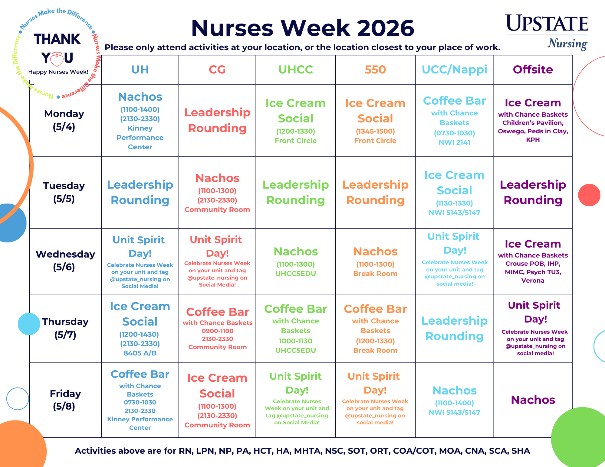 We will be celebrating Nurses Week in two weeks! See the attached calendar for activities and details.