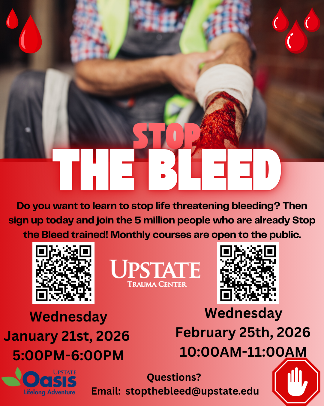 All courses are free and open to the public. Licensed staff interested in becoming instructors, email stopthebleed at upstate.edu<mailto:stopthebleed at upstate.edu> to begin the process. Interested staff must have attended and completed a Stop the Bleed course to instruct. Questions? Email Trauma at Upstate.edu<mailto:Trauma at Upstate.edu>.