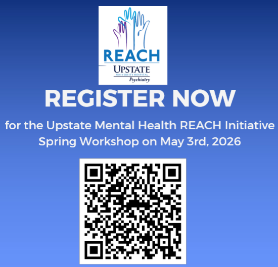The workshop is a live educational activity designated by SUNY Upstate Medical University for a maximum of 6.25 AMA PRA Category 1 Credit(s)™. The AAFP has reviewed Upstate Mental Health REACH Intensive Workshop and deemed it acceptable for up to 6.25 Live AAFP Prescribed credit(s). Term of Approval is from 05/03/2026 to 05/03/2026. Physicians should claim only the credit commensurate with the extent of their participation in the activity.