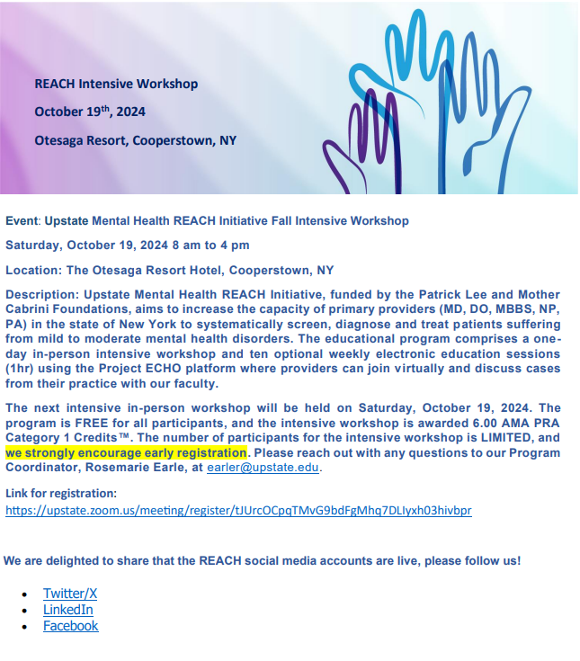 Our REACH Echo program here at Upstate is hosting an upcoming "REACH Intensive Workshop" on October 19th from 8am to 4pm at the Otesaga Resort located in Cooperstown, NY. Please see the informational flyer below, as well as attached: