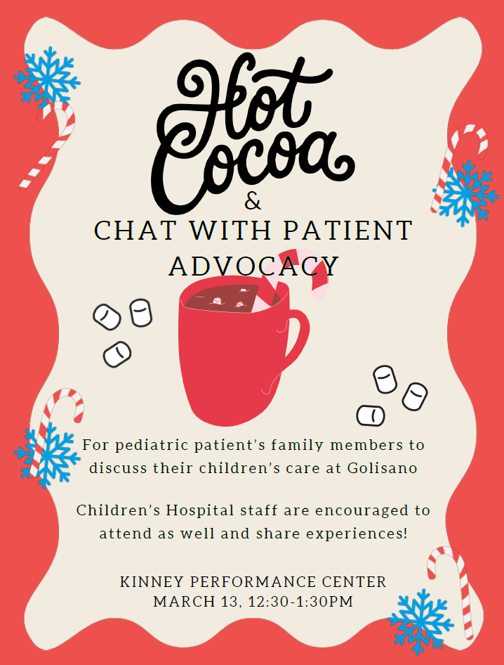 Join us this Friday for Hot Cocoa & Chat with Patient Advocacy, taking place in the Kinney Performance Center from 12:30–1:30 PM. Please post the attached flyer in your patient care areas to help spread the word—our Patient Advocacy team will be available to connect with families and discuss their children’s care at Upstate Golisano. Staff and families are encouraged to attend!