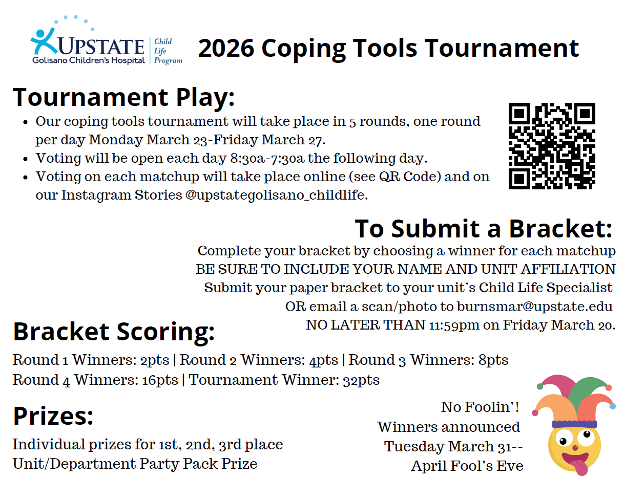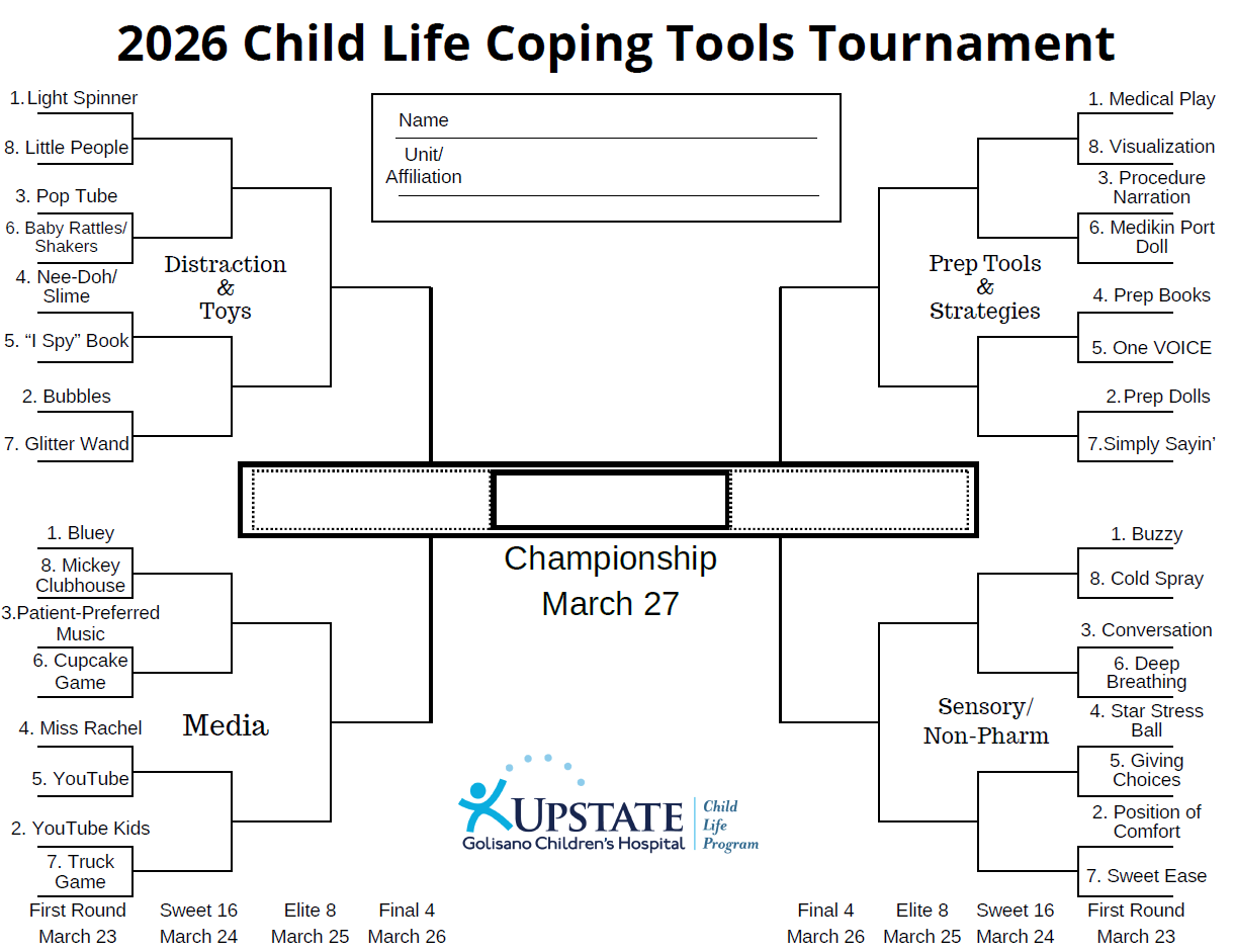 Hello! Please see the attached information on a March Madness competition for Child Life tools. The 2nd page includes instructions. Email Maggie Burns @ BurnsMar at upstate.edu<mailto:BurnsMar at upstate.edu> with questions.