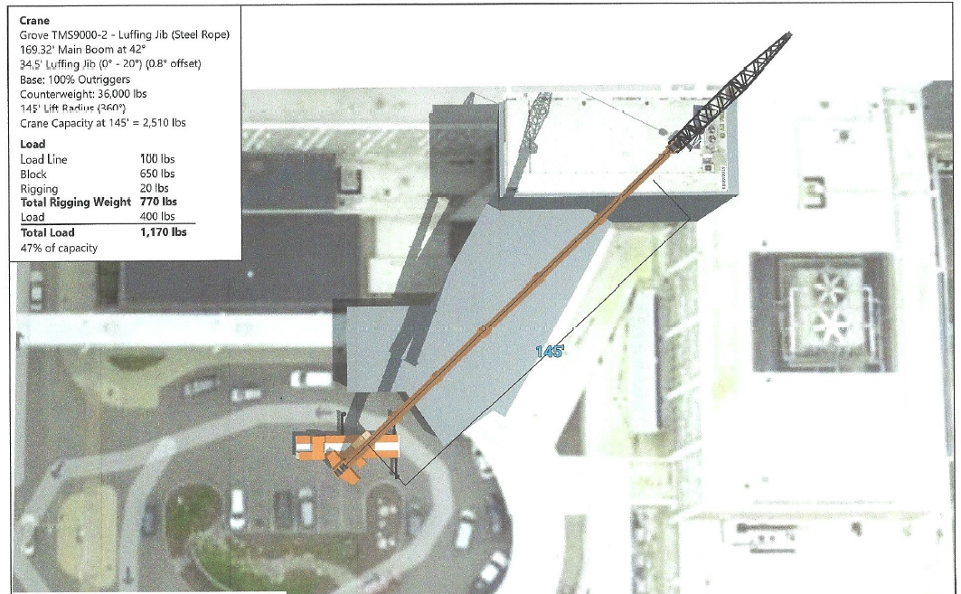 Description of work requiring crane: The crane will be used to rig support steel and a large air conditioning unit on to the roof of the Pediatric Emergency Department (4 North), in support of the 3 West Angio Suite Renovation. The crane's boom will extend over the roof of the Pulmonary Clinic and the pedestrian bridge.