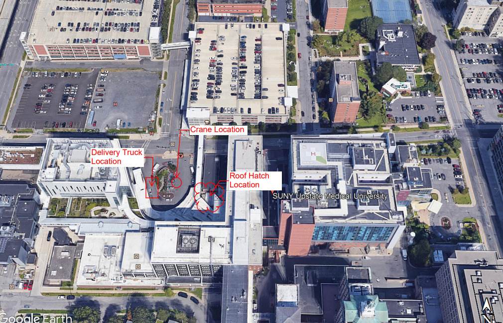 Description of work requiring crane: The crane will be used to remove the hatch into the basement, and we are removing (4) decommissioned units and installing (1) new unit, in support of the Nuclear Camera Renovation. The crane's boom will extend over the roof of the Pulmonary Clinic and the pedestrian bridge.