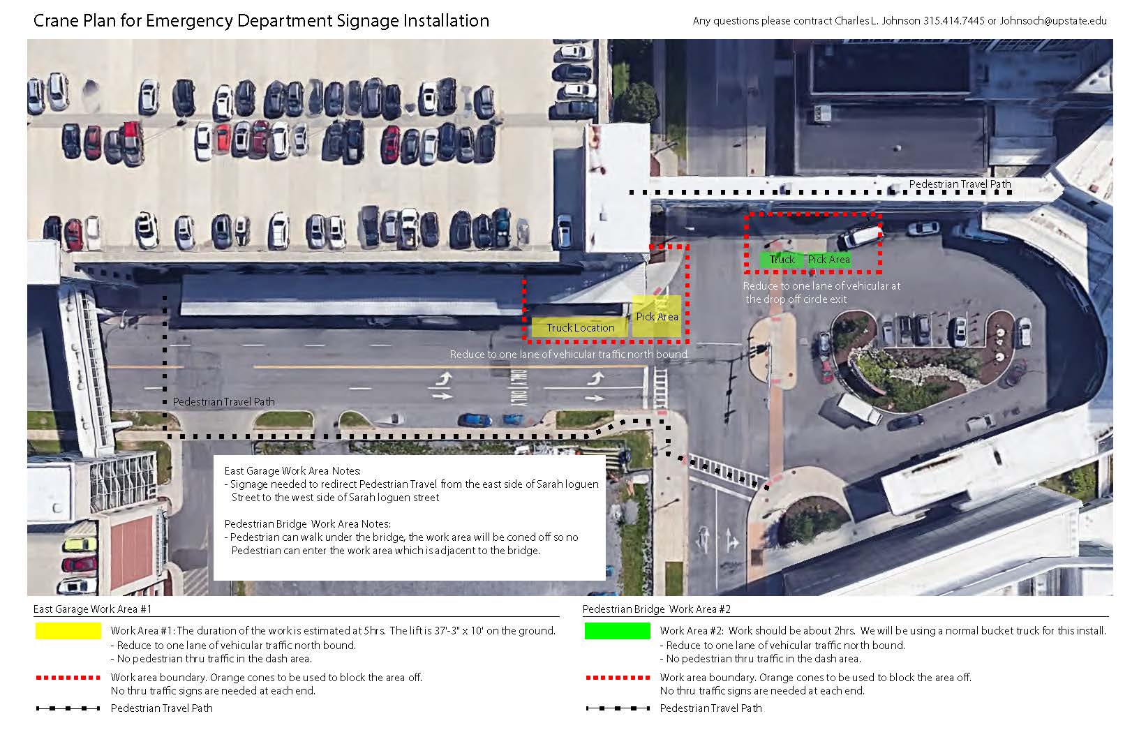 As part of the Emergency Department Way Finding project. UMU Design and Construction has a crane truck scheduled to install new signage on Thursday, April 1st we will be installing new signage to direct traffic to the Emergency Department entrance. This work will take place in two locations. The first will be the Sarah Loguen Street entrance to the East Garage (the corner of Sarah Loguen St. and East Adams St.) will be closed. The second will be at East Adams' intersection and on the drop-off circle adjacent to the Pedestrian Bridge. Please see the plan below for all work locations.